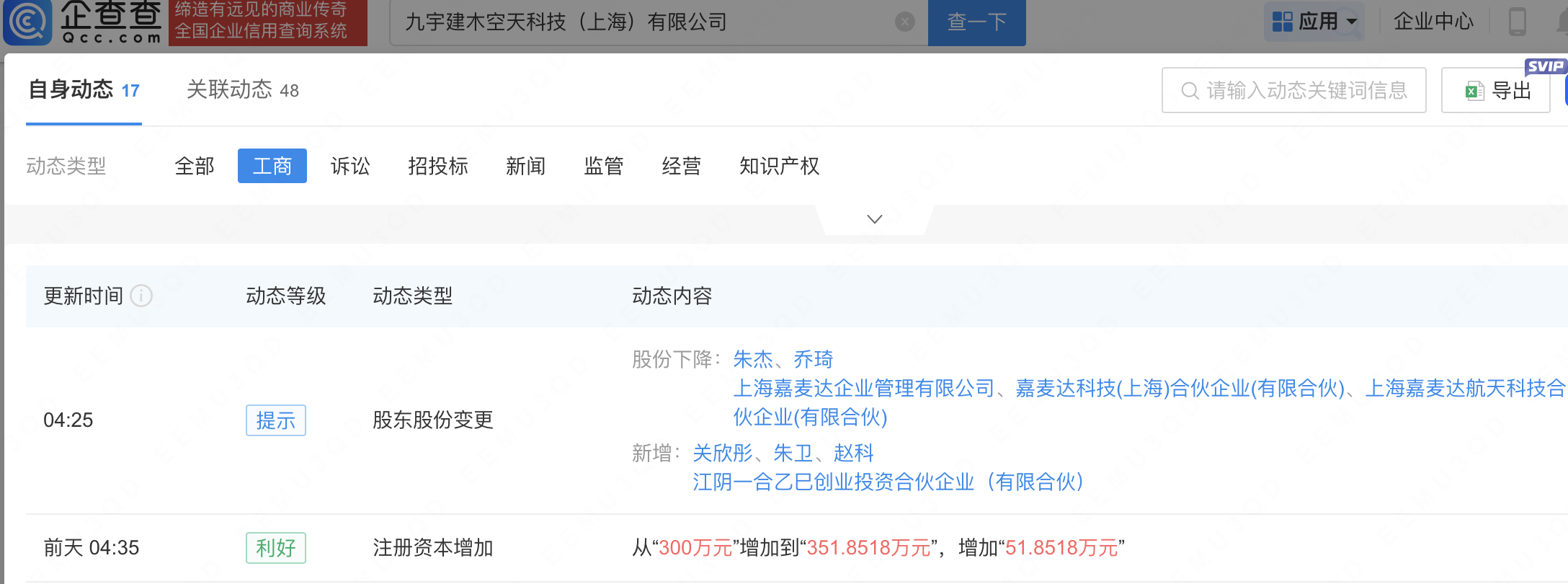 近日,九宇建木空天科技(上海)有限公司发生工商变更,新增江阴一合乙巳创业投资合伙企业(有限合伙)等为股东,后者由九鼎新材(002201)及江顺科技(001400)等共同持股。同时,该公司注册资本增至351.85万元。企查查信息显示,该公司成立于2022年,经营范围包含:3D打印服务;增材制造装备销售;3D打印基础材料销售等。据无锡高新区,九宇建木总部基地已落户无锡,已服务多家国内商业航天头部企业,项目将打造集DED金属3D打印技术开发、新材料、及零部件制造等为一体的商业航天总部基地。